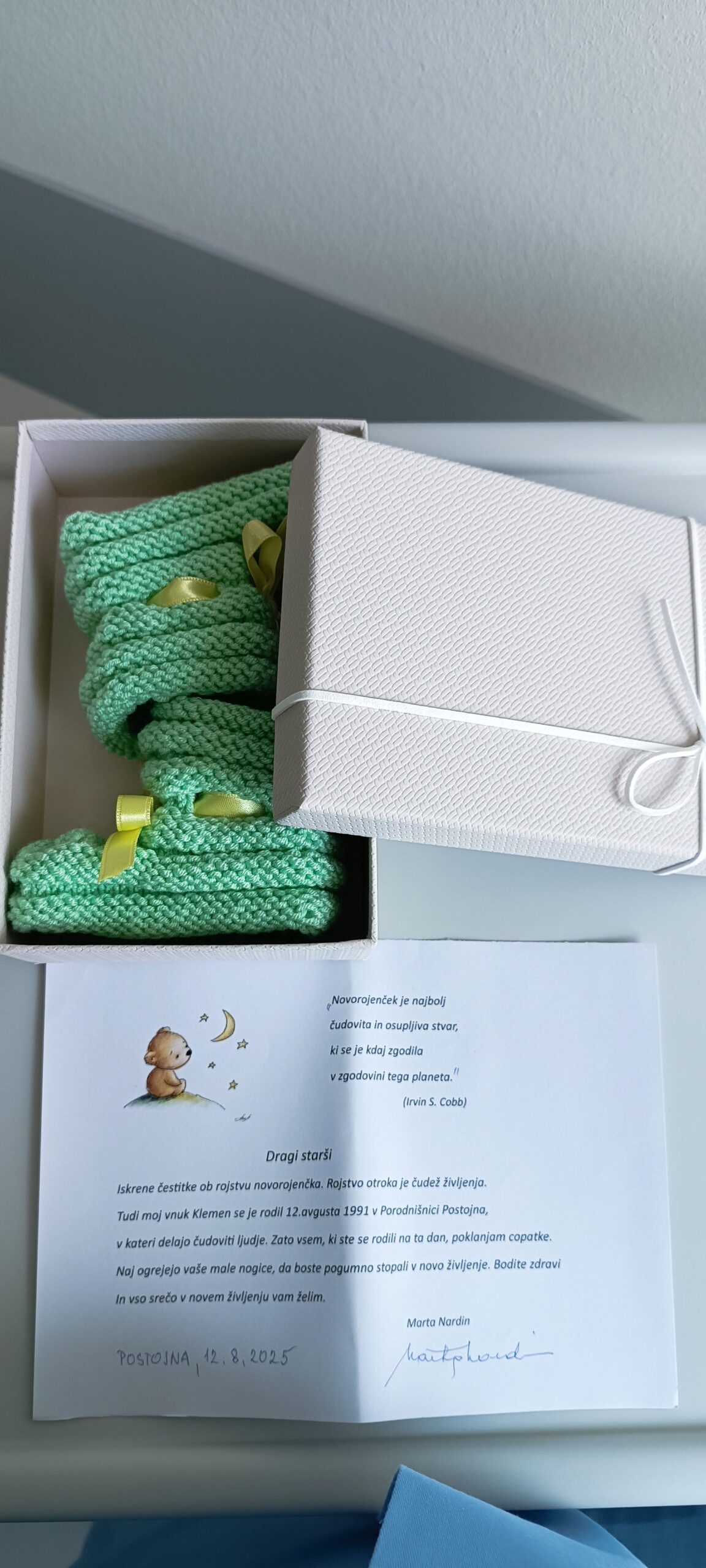V naši porodnišnici smo 12. avgusta, ko se je pri nas rodilo šest otrok, doživeli prav posebno presenečenje. Gospa Marta Nardin, ki se pogosto spomni na našo ustanovo, je na ta dan poskrbela za nepozabno gesto in vsakemu novorojenčku podarila par ljubkih copatk s posebnim posvetilom.